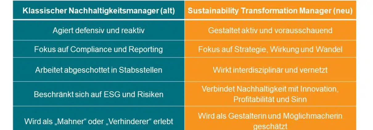 Viele Nachhaltigkeitsmanager arbeiten defensiv, verwalten Nachhaltigkeit. Doch heute braucht es Gestalter. Erfahren Sie, wie Sie sich zur Rolle des Sustainability Transformation Managers entwickeln.
